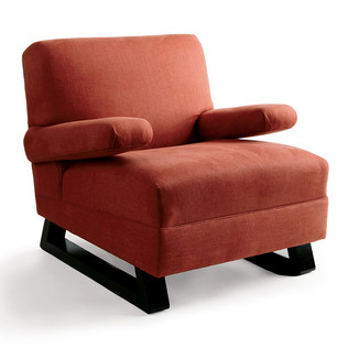 Mid-century upholstered chair with tight seat and back. Stained angled wood base.
