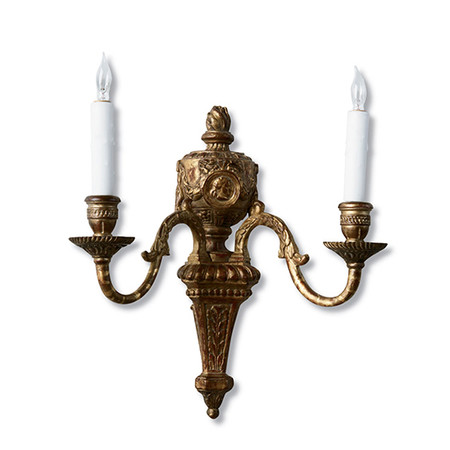 Double armed Italian inspired sconce. Wired for two 25 watt candelabra bulbs. Waxed candlesleeves.
